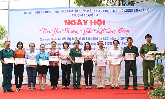 Đồng chí Nguyễn Thị Thu, Chủ tịch Ủy ban MTTQ Việt Nam Quận 4 khen thưởng cho các tập thể có thành tích xuất sắc. |