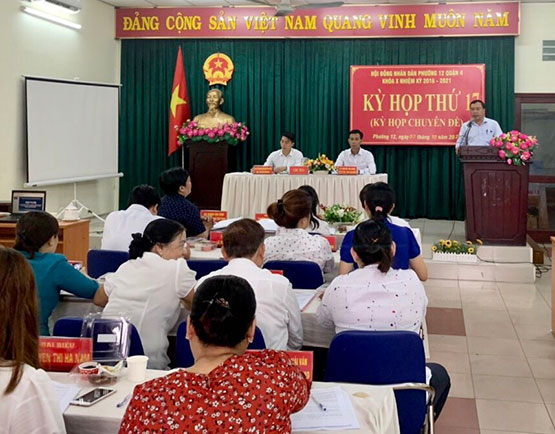 Sáng ngày 07/10/2020, Hội đồng nhân dân (HĐND) Phường 12 tổ chức kỳ họp thứ 17 (kỳ họp chuyên đề) thông qua chủ trương sáp nhập đơn vị hình chính cấp phường trên địa bàn Quận 4. Đến dự có đồng chí Bùi Quốc Tuấn, Phó Chủ tịch HĐND Quận 4; đồng chí Trần Đức Kiên, Trưởng phòng Nội vụ Quận 4.
