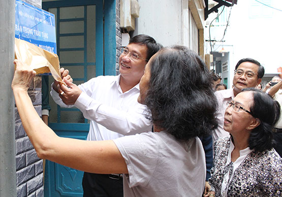 Lãnh đạo Quận 4 thực hiện nghi thức bàn giao mái ấm tình thương cho bà Lê Thị Kim Cúc. |