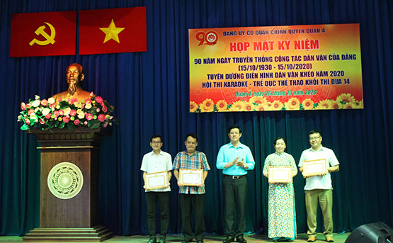 Dịp này, Đảng ủy Cơ quan chính quyền Quận 4 đã tuyên dương 7 điển hình tập thể và 4 cá nhân vì đã có thành tích thực hiện tốt trong việc thực hiện phong trào thi đua “Dân vận khéo” năm 2020.