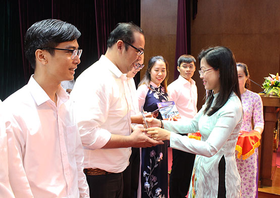 Đồng chí Trần Thị Thanh Thảo, Trưởng Ban Tuyên giáo Quận ủy trao bằng tốt nghiệp cho các học viên. |