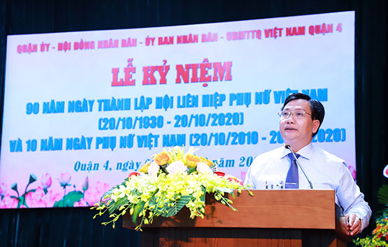 Phát biểu tại lễ kỷ niệm, đồng chí Phó Bí thư Thường trực Quận ủy Lý Tấn Hòa chúc mừng và biểu dương những kết quả của phong trào phụ nữ và Hội LHPN Quận 4 trong thời gian qua. Đồng thời đề nghị Hội LHPN Quận 4 triển khai, quán triệt rộng rãi trong hội viên, phụ nữ về Nghị quyết Đại hội Đảng bộ quận lần thứ XII, nhiệm kỳ 2020 – 2025; tập trung giải pháp cụ thể, đạt mục tiêu Chương trình giảm nghèo bền vững, nâng cao chất lượng cuộc sống người dân mà Nghị quyết Đại hội Đảng bộ quận nhiệm kỳ 2020 – 2025 đề ra. Hội LHPN Quận 4 cần tiếp tục đổi mới nội dung, đa dạng hóa các hoạt động phong trào, thu hút các tầng lớp phụ nữ tham gia, nhất là phụ nữ trí thức và phụ nữ trong các chung cư; tổ chức tốt các hoạt động chăm lo đời sống hội viên, người dân trong đợt dịch bệnh Covid-19. Bên cạnh đó, cần tiếp tục thực hiện các phong trào thi đua “Phụ nữ tích cực học tập, lao động sáng tạo, xây dựng gia đình hạnh phúc”, Cuộc vận động “Rèn luyện phẩm chất đạo đức: tự tin, tự trọng, trung hậu, đảm đang” ; chú trọng tuyên dương, tôn vinh các điển hình tiêu biểu trên các lĩnh vực.