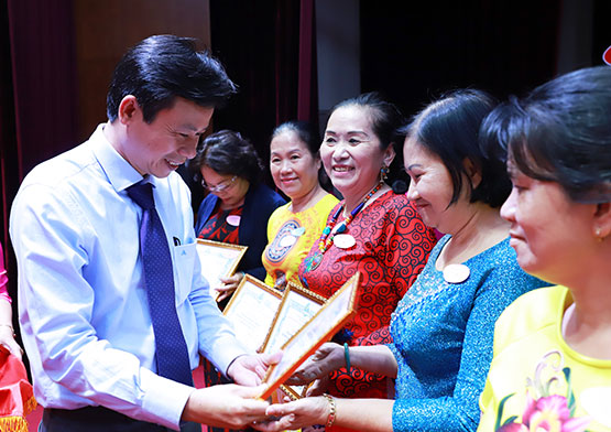 Đồng chí Trần Thị Phương Hoa, Phó Chủ tịch Hội LHPN TPHCM (bìa phải hàng trên) và đồng chí Thái Thị Bích Liên, Bí thư Quận ủy (bía trái hàng trên) trao Kỷ niệm chương “Vì sự phát triển của phụ nữ Việt Nam” cho các cá nhân. |