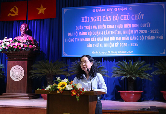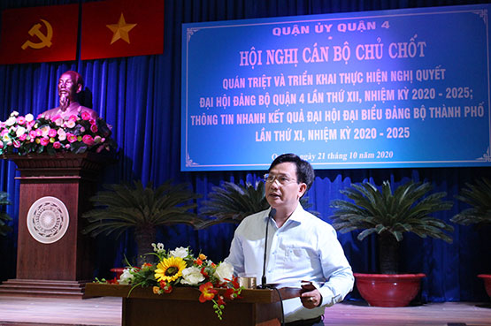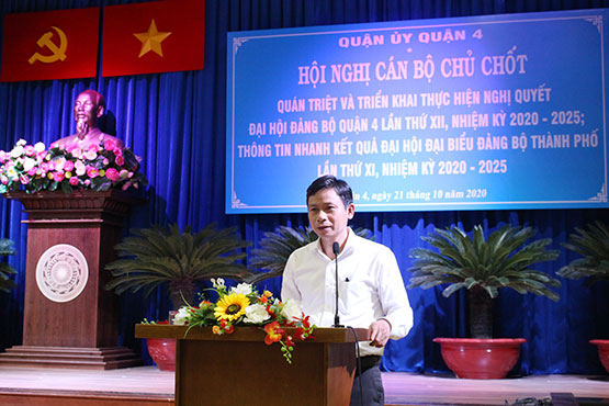 Chiều ngày 21/10/2020, Quận ủy Quận 4 tổ chức hội nghị cán bộ chủ chốt quán triệt và triển khai thực hiện Nghị quyết Đại hội Đảng bộ Quận 4 lần thứ XII, nhiệm kỳ 2020 - 2025; thông tin nhanh kết quả Đại hội Đại biểu Đảng bộ Thành phố Hồ Chí Minh, lần thứ XI, nhiệm kỳ 2020 - 2025. Đến dự có các đồng chí: Thái Thị Bích Liên, Thành ủy viên, Bí thư Quận ủy; Lý Tấn Hòa, Phó Bí thư Thường trực Quận ủy; Lê Văn Chiến, Chủ tịch UBND Quận 4 và 230 cán bộ chủ chốt cấp quận, cơ sở.
