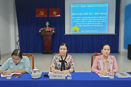Tối ngày 22/10/2020, Ủy ban Mặt trận Tổ quốc Việt Nam Phường 9 tổ chức hội nghị tiếp xúc đối thoại giữa lãnh đạo Đảng, chính quyền với đoàn viên, hội viên của các tổ chức chính trị - xã hội và Nhân dân trên địa bàn Khu phố 3, Phường 9 theo Quyết định số 935-QĐ/TU của Ban Thường vụ Thành ủy.