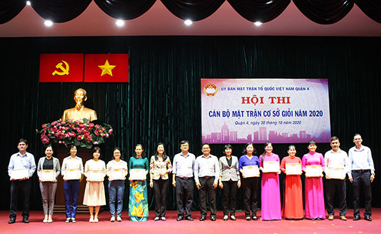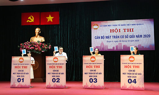 Sáng ngày 30/10/2020, Ủy ban Mặt trận Tổ quốc (MTTQ) Việt Nam Quận 4 tổ chức Hội thi cán bộ Mặt trận cơ sở giỏi năm 2020. Đến dự có các đồng chí: Trần Thị Thanh Thảo, Trưởng Ban Tuyên giáo Quận ủy; Phạm Minh Tuấn, Phó Chủ tịch Thường trực Hội đồng nhân dân quận; Nguyễn Thị Thu, Chủ tịch Ủy ban MTTQ quận.