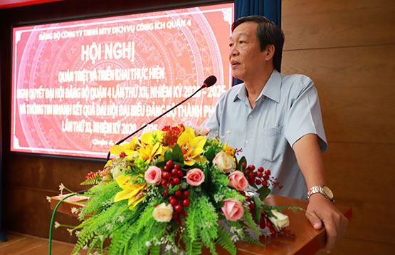 Sáng 02/11/2020, Đảng ủy Công ty Trách nhiệm Hữu hạn Một thành viên (TNHH MTV) Dịch vụ Công ích Quận 4 tổ chức hội nghị tuyên truyền, quán triệt và triển khai thực hiện Nghị quyết Đại hội Đảng bộ Quận 4 lần thứ XII, nhiệm kỳ 2020 - 2025. Đồng chí Nguyễn Tiến Đạt, Nguyên Chủ tịch UBND Quận 4, báo cáo viên hội nghị.