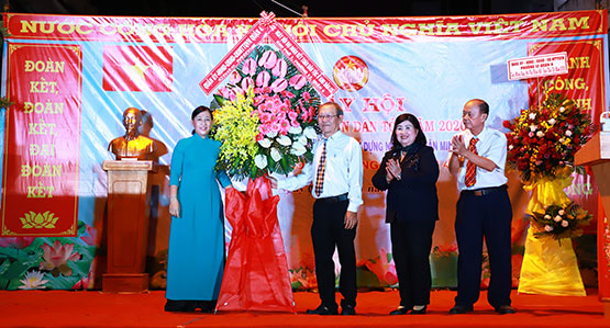 Đồng chí Nguyễn Thị Hồng Diễm, Trưởng Ban Tổ chức Quận ủy (bìa trái) tặng hoa chúc mừng ngày hội. |