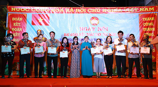 Đồng chí Nguyễn Thị Hồng Diễm, Trưởng Ban Tổ chức Quận ủy (thứ 6 từ phải) tặng Giấy khen “Gia đình văn hóa tiêu biểu” cho các hộ dân. |