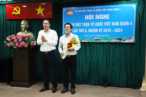 Đồng chí Nguyễn Thành Trung, Phó Chủ tịch Ủy ban MTTQ Việt Nam Thành phố tặng hoa chúc mừng Ủy viên Ủy ban MTTQ Việt Nam Quận 4. |