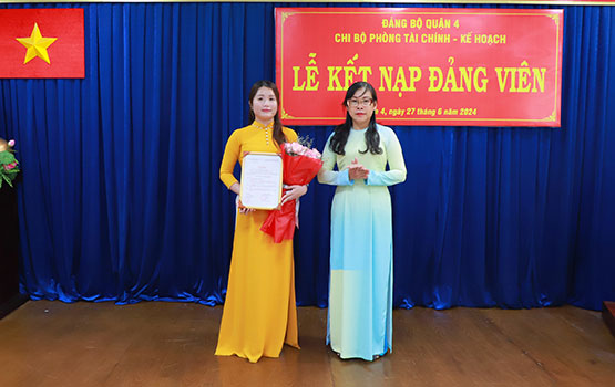 Sáng ngày 27/6/2024, Chi bộ Phòng Tài chính - Kế hoạch Quận 4 tổ chức Lễ kết nạp đảng viên mới cho quần chúng ưu tú Lê Minh Thu Trâm, chuyên viên Phòng Tài chính - Kế hoạch Quận 4.