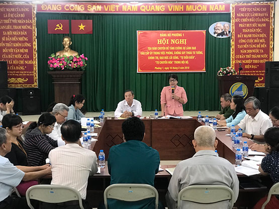 Sáng ngày 16/8/2018, Đảng bộ Phường 1 tổ chức hội nghị chuyên đề “Tăng cường sự lãnh đạo của cấp ủy trong việc phòng, chống suy thoái tư tưởng, chính trị, đạo đức lối sống, “tự diễn biến”, “tự chuyển hóa” trong nội bộ”.